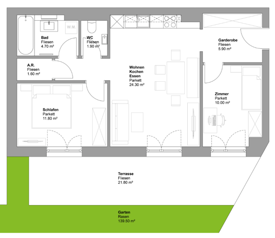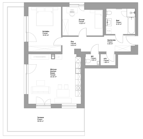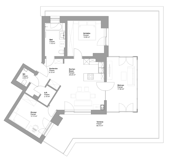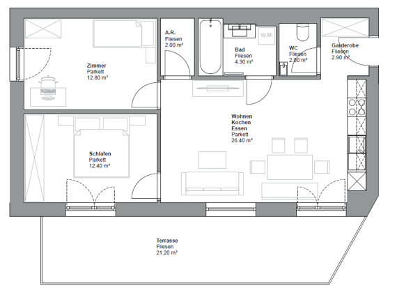 84,90 m² – 1 Küche/Essen/Wohnen – 2 Schlafzimmer – 1 Bad mit Badewanne – 1 WC – Garderobe – Terrasse