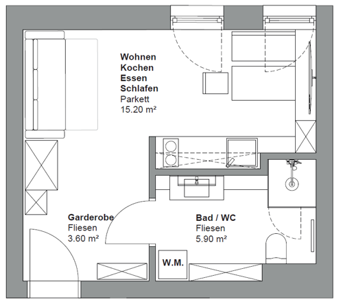 24,70 m² – 1 Küche/Essen/Wohnen/Schlafen – 1 Bad/WC – 1 Vorraum