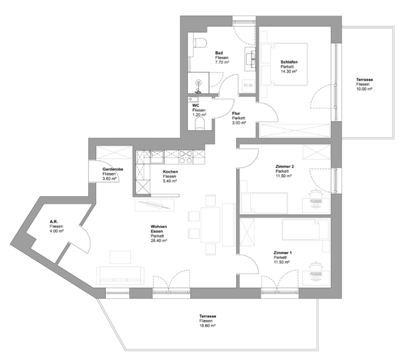 90,60 m² – 1 Küche – 1 Wohnen/Essen – 3 Schlafzimmer – 1 Bad – 1 WC – 1 Vorraum – 1 Abstellraum – 2 Terrassen